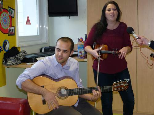 P1060254Les jeunes hospitalisés au CHU de Nantes reçoivent le duo Zama, Zaïdi Diab (violon) et Mathieu Layazid (guitare). Belle rencontre chaleureuse avec deux musiciens épris de liberté